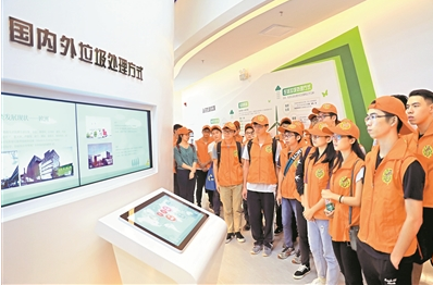 大學(xué)生在科普長(zhǎng)廊參觀并聽(tīng)講解員講述垃圾處理的先進(jìn)經(jīng)驗(yàn)。