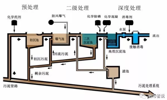 一個采用活性污泥法的污水處理廠,一般有三個處理區(qū)域,為預(yù)處理段,二級處理段,深度處理段,在每個階段,都會產(chǎn)生不同的污泥,在上圖中我們可以看到,預(yù)處理段的初沉池會產(chǎn)生初沉污泥,在曝氣池和二沉池組成的生物處理系統(tǒng),會產(chǎn)生活性污泥的剩余污泥,在深度處理段,會產(chǎn)生化學(xué)藥劑產(chǎn)生的化學(xué)污泥,這些污泥通過地下管路的匯集,最終進(jìn)入到污泥處置單元,進(jìn)行污泥的處理。