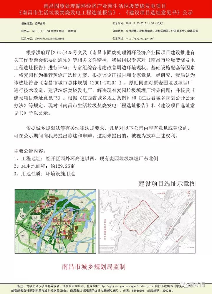 目前,《南昌市生活垃圾焚燒發(fā)電工程選址報(bào)告》和《建設(shè)項(xiàng)目選址意見(jiàn)書(shū)》已對(duì)外公示。凡對(duì)公示內(nèi)容有意見(jiàn)或建議的,可在公示期間向南昌市城鄉(xiāng)規(guī)劃局提出陳述和申辯,公示時(shí)間11月20日-30日,聯(lián)系電話0791-87121329/82329666。