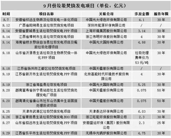 據(jù)不完全數(shù)據(jù)顯示,2017年9月共公開了15個垃圾焚燒發(fā)電項目,涉及金額超40億。中國光大綠色環(huán)保有限公司公開的3個新項目,總投資逾9億元,浙江省海鹽縣的垃圾發(fā)電項目單筆價值也在5億左右,江西樂平市垃圾焚燒項目也預(yù)計投資約4.7億元。
