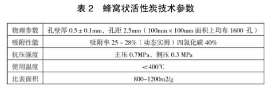 b)吸附箱采用抽屜式結(jié)構(gòu),裝填方便、便于更換。采用新型的活性炭吸附材料——蜂窩狀活性炭,與粒狀相比具有優(yōu)越的動(dòng)力學(xué)性能。極適合于大風(fēng)量下使用。由于其比重為條形活性炭纖維的8-10倍,再生前吸附有機(jī)溶劑可以達(dá)到活性炭總重量的25%,具有使用壽命長(zhǎng),吸附系統(tǒng)運(yùn)行阻力低,凈化效率高等特點(diǎn)。蜂窩活性炭主要技術(shù)參數(shù)如表2所示: