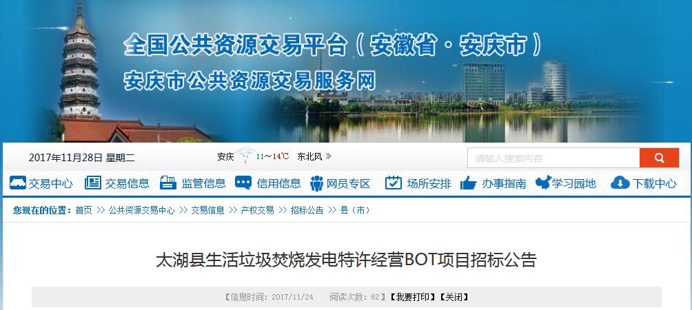 從安徽省安慶市公共資源交易平臺獲悉,近日發(fā)布了太湖縣生活垃圾焚燒發(fā)電特許經(jīng)營BOT項目招標(biāo)公告 ,具體公告內(nèi)容如下: