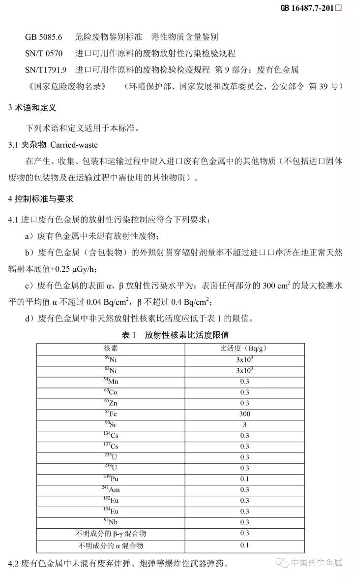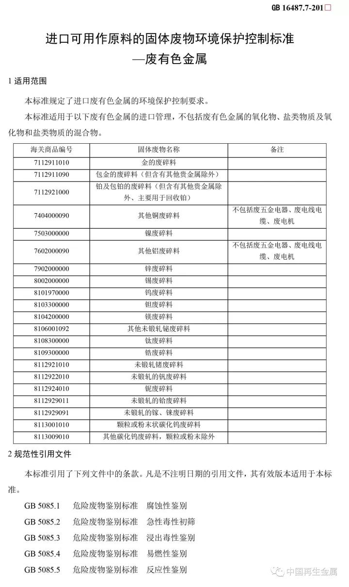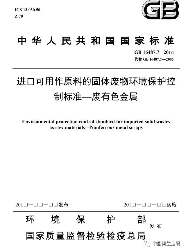 本標準是進口固體廢物環(huán)境保護系列控制標準之一,適用于進口可用作原料的固體廢物目錄中有關廢有色金屬的進口管理。