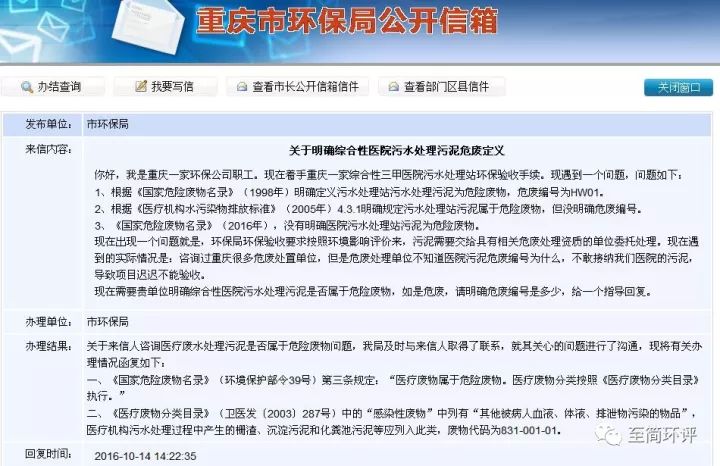 關(guān)于來信人咨詢醫(yī)療廢水處理污泥是否屬于危險(xiǎn)廢物問題,我局及時(shí)與來信人取得了聯(lián)系,就其關(guān)心的問題進(jìn)行了溝通,現(xiàn)將有關(guān)辦理情況函復(fù)如下: