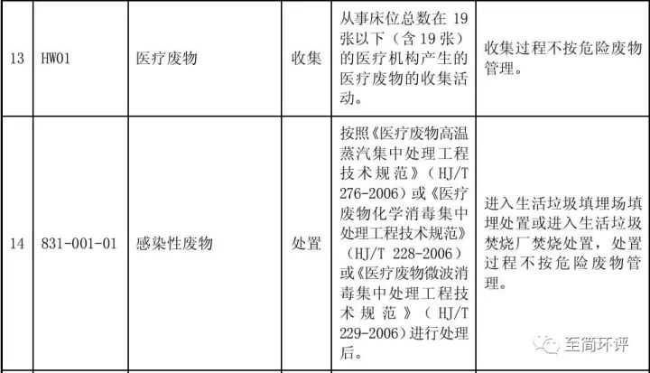 根據(jù)上文中將醫(yī)療廢水污泥歸類于醫(yī)療廢物中的“感染性廢物”(831-001-01),結(jié)合上表,豁免情況就很明朗了。即19張(含)床位數(shù)以下的醫(yī)療機(jī)構(gòu)產(chǎn)生的醫(yī)療廢物的收集活動(dòng),包括污泥,收集過程不按危險(xiǎn)廢物管理;另外,感染性廢物,當(dāng)然包括污泥處置環(huán)節(jié)不按危險(xiǎn)廢物處理。