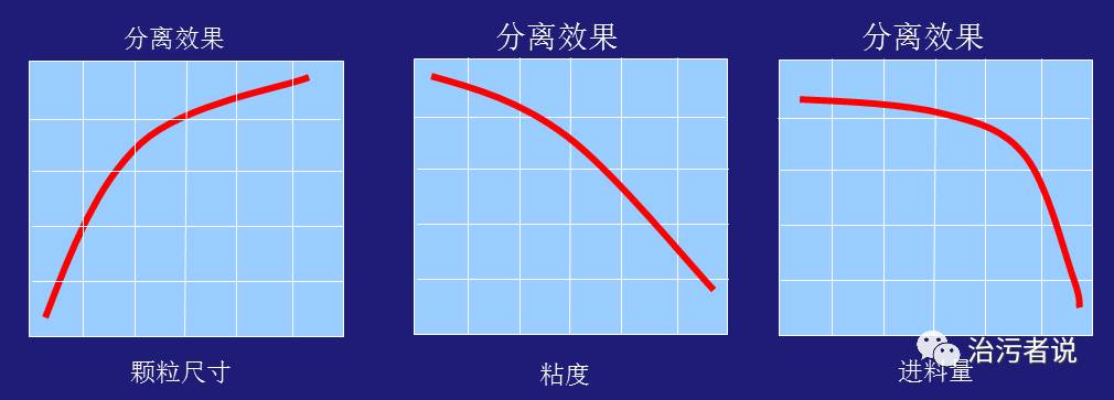 從公式中可以看出來,顆粒的沉降速度與顆粒的直徑成平方關(guān)系,與顆粒和液體的密度差成正比,與液體粘度成反比。在分離過程中,顆粒的沉降速度越快,分離效果就越顯著,斯托克斯定律表明了分離效果與物性參數(shù)的基本關(guān)系。這個公式也說明離心機分離效果是和與顆粒尺寸, 粘度及進料量有關(guān)的,可以從下面的幾個曲線看到在離心旋轉(zhuǎn)分離中,各項參數(shù)對分離效果的影響。這些參數(shù)也就反映了我們在運行管理中,通過合理的投加PAM,泥水分離的效果明顯,藥劑完全和污泥顆粒反應結(jié)合成更大的顆粒,上清液中藥劑的含量很低,上清液的粘度不受藥劑的影響,這樣離心機的作用也就發(fā)揮的越好,也是脫水后污泥的含水率更低的調(diào)整方式,所以藥劑的選擇在離心機的使用中使很重要的一項工作。