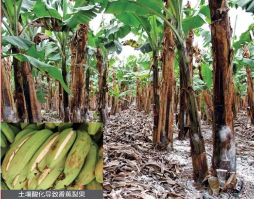 在廣西金穗香蕉公司發(fā)現(xiàn)的裂果香蕉,上億元的香蕉因此爛掉了。經(jīng)我們測試,種植香蕉的土壤很酸,特別是種植時候要挖深溝,深溝里的生土pH 值只有3 點多到4 點多,鈣鎂吸收量非常低,果皮韌性差,在水分比較多的時候,果肉膨脹得快,果皮膨脹慢,就會裂果。后經(jīng)我們的優(yōu)化肥料配方和改良土壤,給金穗公司節(jié)省1800 多萬元成本,徹底解決了裂果問題。公司也建立了一個有機(jī)肥堆肥廠,生產(chǎn)有機(jī)肥,再施加石灰,來改造酸性土壤。