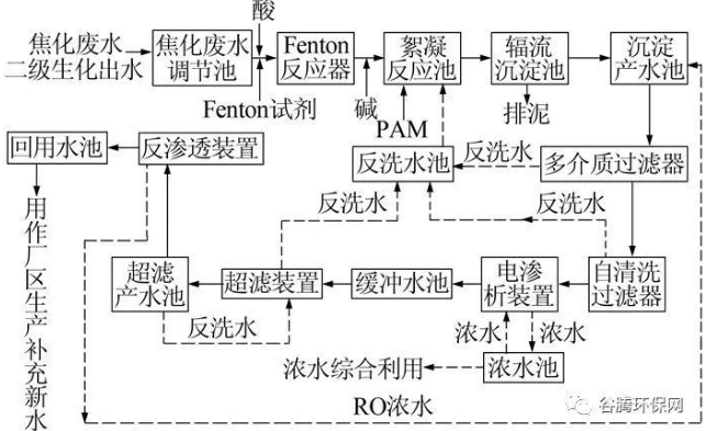 焦化廢水二級生化出水深度處理系統(tǒng)的外排濃水經(jīng)混合后自流進(jìn)入焦化廢水調(diào)節(jié)池, 調(diào)節(jié)水量及水質(zhì)后經(jīng)泵加壓提升進(jìn)入Fenton 反應(yīng)器,加酸控制Fenton 反應(yīng)器的進(jìn)水pH 并投加Fenton 試劑,其出水進(jìn)入絮凝反應(yīng)池,加堿調(diào)節(jié)使絮凝反應(yīng)池進(jìn)水呈中性, 同時投加PAM 強(qiáng)化絮凝, 出水進(jìn)入輻流沉淀池,沉淀池出水進(jìn)入沉淀產(chǎn)水池,再次加壓提升后依次通過多介質(zhì)過濾器及自清洗過濾器進(jìn)行預(yù)過濾,出水進(jìn)入電滲析裝置進(jìn)行初次脫鹽,其出水進(jìn)入緩沖水池,電滲析裝置的濃水排入濃水池供內(nèi)循環(huán)利用, 多余濃水排出系統(tǒng)進(jìn)行綜合利用, 緩沖水池的出水經(jīng)泵提升后進(jìn)入超濾裝置,出水進(jìn)入超濾產(chǎn)水池,超濾產(chǎn)水池出水經(jīng)泵提升通過保安過濾器后進(jìn)入反滲透裝置進(jìn)行再次脫鹽,出水進(jìn)入回用水池,作為廠區(qū)生產(chǎn)補(bǔ)充新水使用, 反滲透裝置濃水回流至沉淀產(chǎn)水池進(jìn)行再次循環(huán)脫鹽。