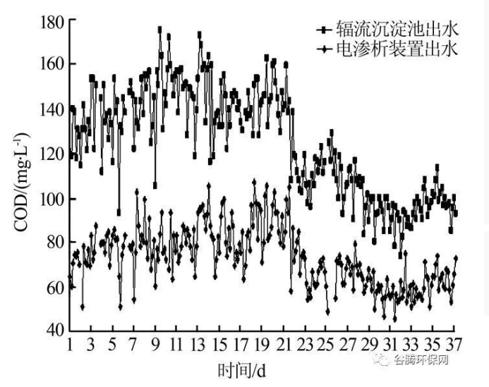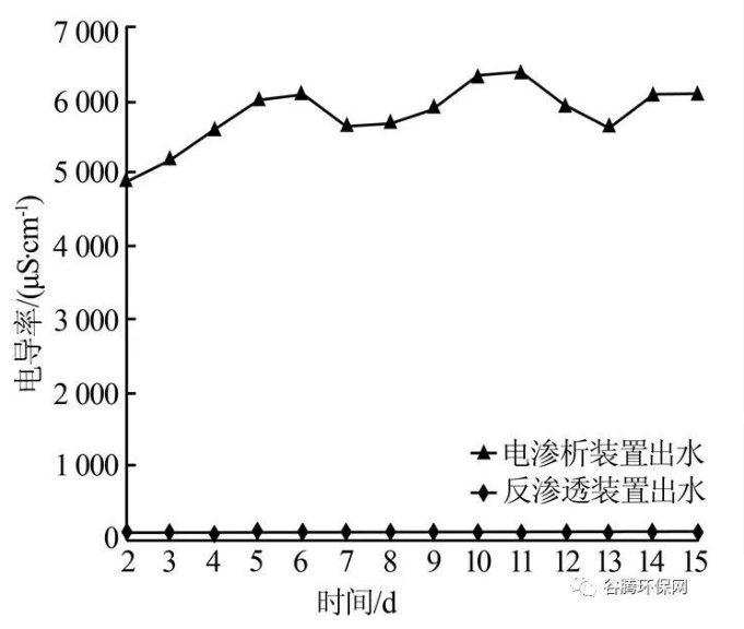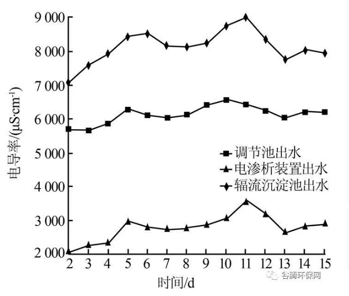 從圖3 可知, 在輻流沉淀池出水COD 平均為107.1 mg/L 條件下,電滲析裝置出水的COD 平均為77.84 mg/L,平均去除率為27.3%,說明多介質(zhì)過濾器、自清洗過濾器對輻流沉淀池出水COD 去除效果穩(wěn)定,可以保證電滲析裝置正常運(yùn)行。根據(jù)工程實際運(yùn)行工況,電滲析裝置的清洗周期一般為2 個月。從圖4 可知,該工藝的調(diào)節(jié)池出水、輻流沉淀池出水、電滲析裝置出水的電導(dǎo)率分別在5 672~6 573、7 090~9 002、2 127~3 600 μS/cm范圍內(nèi)。由于在Fenton 反應(yīng)器進(jìn)水投加硫酸、絮凝反應(yīng)池進(jìn)水投加NaOH,導(dǎo)致輻流沉淀池出水平均電導(dǎo)率較調(diào)節(jié)池出水高31.4%,但經(jīng)過初次脫鹽后,電滲析裝置出水平均電導(dǎo)率較調(diào)節(jié)池出水低53.2%,脫鹽效果顯著,緩解了后續(xù)反滲透膜的脫鹽壓力。