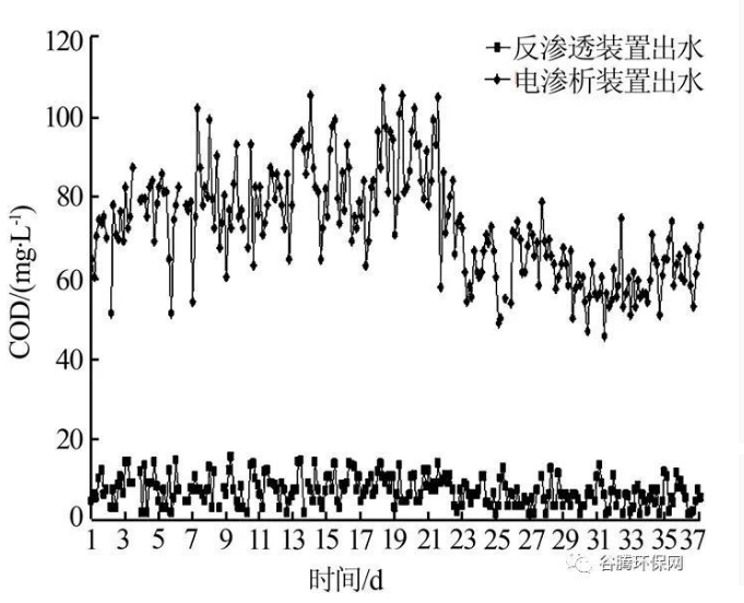 2.3 超濾裝置、反滲透裝置:超濾裝置作為反滲透裝置的預(yù)處理裝置, 為反滲透裝置提供濁度<0.2 NTU、SDI<3 的進(jìn)水,在降低反滲透裝置的化學(xué)清洗頻率、延長反滲透膜的使用壽命及保障反滲透系統(tǒng)的穩(wěn)定運(yùn)行等方面起到保安作用。反滲透裝置作為二級脫鹽裝置,可將廢水中剩余的溶解鹽、膠體、有機(jī)物等去除。該工程采用的超濾膜材質(zhì)為聚偏氟乙烯(PVDF)膜,膜數(shù)量為60 支/套、平均運(yùn)行通量為60 L/(m2˙h)、產(chǎn)水量為180 m3/(h˙套),共2 套,超濾產(chǎn)水進(jìn)入超濾產(chǎn)水池(ht為0.67 h)。反滲透裝置前設(shè)置保安過濾器,孔徑為5 μm,共2 臺。反滲透裝置采用渦卷式反滲透膜,膜數(shù)量為204 支/套、回收率70%、平均運(yùn)行通量為15 L/(m2˙h)、產(chǎn)水量為113 m3/(h˙套),共2 套。廢水經(jīng)超濾裝置、反滲透裝置處理后對COD、電導(dǎo)率的去除效果如圖5、圖6 所示。