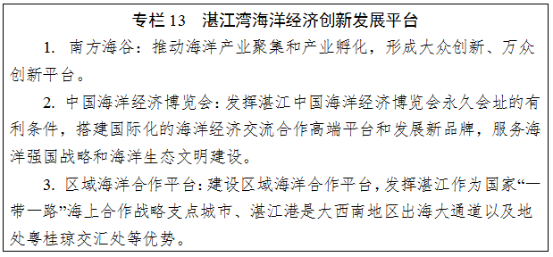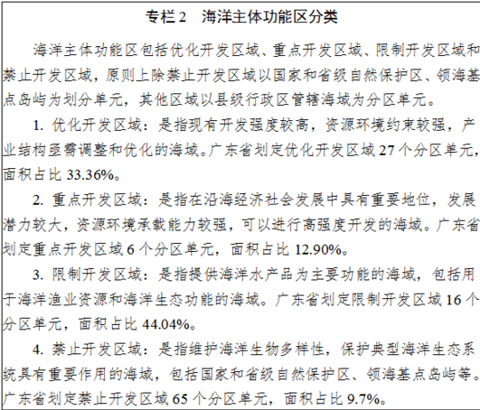 根據(jù)資源環(huán)境承載能力、發(fā)展需求和空間開發(fā)適宜性,科學(xué)選劃集約節(jié)約利用海域。合理安排廣東自貿(mào)區(qū)、廣東海洋經(jīng)濟(jì)綜合試驗(yàn)區(qū)及粵港澳大灣區(qū)等國家重大戰(zhàn)略規(guī)劃用海需求,引導(dǎo)特色產(chǎn)業(yè)園區(qū)向東莞濱海灣、中山翠亨、江門大廣海灣、惠州環(huán)大亞灣、深汕特別合作區(qū)、汕頭海灣、陽江海陵灣、茂名博賀灣、湛江灣等集聚發(fā)展;支持先進(jìn)海洋裝備制造等海洋戰(zhàn)略性新興產(chǎn)業(yè)和綠色環(huán)保產(chǎn)業(yè)、循環(huán)經(jīng)濟(jì)產(chǎn)業(yè)等用海。