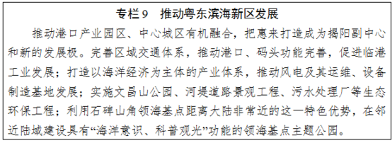 建設(shè)廣東省新型城鎮(zhèn)化綜合試驗(yàn)區(qū)、產(chǎn)城融合示范區(qū)、區(qū)域協(xié)調(diào)發(fā)展先行區(qū);打造世界級新能源新材料聚集地、全國重要石化能源基地、粵東專業(yè)物流中心、粵東醫(yī)教高地、重要濱海旅游目的地;沿海綠色防護(hù)帶重要組成部分。