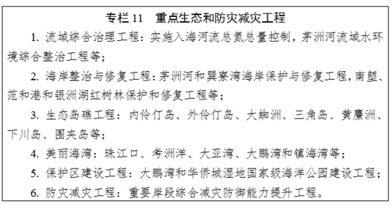 灣區(qū)重點(diǎn)開展龍頭山“浪漫海岸”岸線整治工程;推進(jìn)放雞島生態(tài)島礁工程和水東灣美麗海灣建設(shè);開展茂名石化基地海洋災(zāi)害防御能力提升工程。