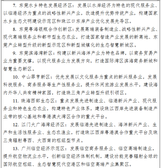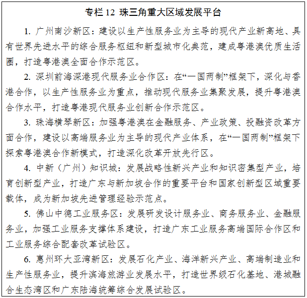 產(chǎn)業(yè)發(fā)展。積極落實(shí)粵港澳大灣區(qū)發(fā)展戰(zhàn)略,發(fā)揮深圳、廣州龍頭帶動作用,大力推進(jìn)廣深科技創(chuàng)新走廊建設(shè),形成高度發(fā)達(dá)的創(chuàng)新經(jīng)濟(jì)帶,輻射帶動全省創(chuàng)新發(fā)展。打造全球產(chǎn)業(yè)創(chuàng)新高地,建設(shè)具有國際影響力的戰(zhàn)略性新興產(chǎn)業(yè)高地、信息經(jīng)濟(jì)高地、智能制造高地,重點(diǎn)布局在深圳、廣州、珠海等地。建設(shè)世界級先進(jìn)的電子信息、裝備制造、石化等產(chǎn)業(yè)基地,重點(diǎn)布局在佛山、惠州、東莞、中山、江門等。重點(diǎn)打造全球金融中心、全球貿(mào)易中心、全球物流中心、國際化的消費(fèi)中心、世界休閑旅游中心,主要布局在廣州、深圳。大力發(fā)展廣深珠高端制造業(yè),支持珠海培育智能制造和戰(zhàn)略性新興產(chǎn)業(yè),帶動珠江西岸產(chǎn)業(yè)發(fā)展。大力建設(shè)佛山和東莞科技成果轉(zhuǎn)化基地。建設(shè)惠州、中山、江門等區(qū)域生產(chǎn)制造基地。加快構(gòu)筑區(qū)域發(fā)展重大平臺。建設(shè)南海油氣資源勘探開發(fā)保障基地,加快推進(jìn)天然氣水合物產(chǎn)業(yè)發(fā)展;推動江門循環(huán)經(jīng)濟(jì)和環(huán)保產(chǎn)業(yè)示范區(qū)建設(shè);在港口、桂山、金灣等海域發(fā)展海上風(fēng)電。