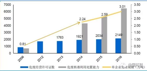 根據(jù)《固體廢物污染環(huán)境防治法執(zhí)法檢查報告》顯示,2016年全國持危險廢物經營許可證的單位設計處置能力為6471萬噸,實際經營規(guī)模只有1629萬噸,實際處理比例僅為25%。