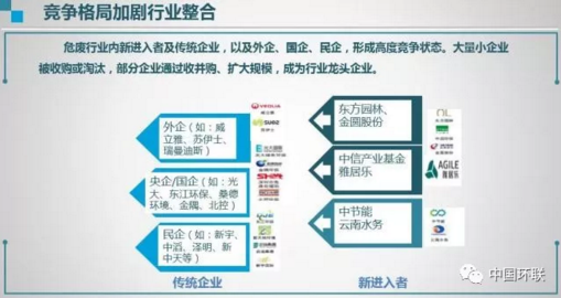 危廢市場格局是危廢行業(yè)內新進入者及傳統(tǒng)企業(yè),及外企、國企、民企,形成高度競爭狀態(tài)。在環(huán)保調控力度加強的情況下,很多資本躍躍欲試,進入危廢處置行業(yè),包括一些大型集團,房地產企業(yè),綠化企業(yè),或者投資機構等。企業(yè)跑馬圈地和異地收購將會持續(xù)下去,搶占危廢市場或將愈演愈烈,大量小企業(yè)被收購或淘汰,部分企業(yè)通過收并購、擴大規(guī)模,成為行業(yè)龍頭企業(yè)。