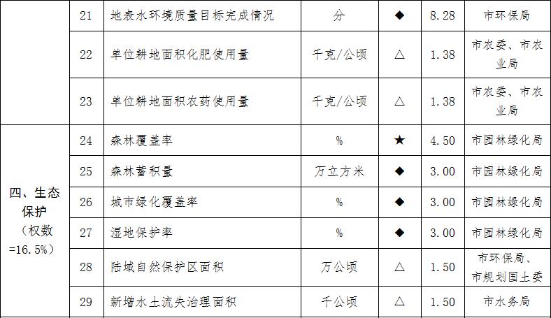 2.“資源利用”“生態(tài)環(huán)境保護”類各子目標采用專項考核部門組織開展專項考核認定的數(shù)據(jù)??己酥笜宋锤采w的區(qū),對應(yīng)的指標分值分攤至該區(qū)同類別其他指標,保持“資源利用”“生態(tài)環(huán)境保護”一級指標總分不變。