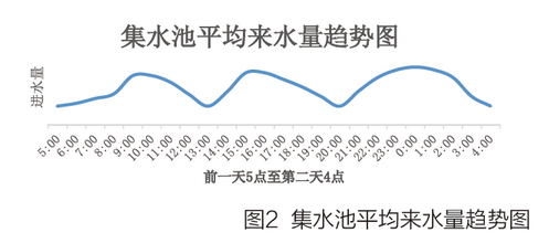 二十四小時平均進水量趨勢圖如圖2所示,從圖可以看出,在早上7點左右進水量逐漸增大,當(dāng)?shù)竭_十一點左右到達第一次峰值。這是由于人們早上用水量增大,通常情況下早上七點左右為用水高峰,而通過管網(wǎng)的延時,導(dǎo)致進水量在十點左右到達高峰。同樣的十三點和第二天零點分別是兩次進水高峰。第三次高峰段的延長是由于這段時間人們生活所致,例如晚飯時間用水及洗澡時間的用水等造成水量的持續(xù)高峰。