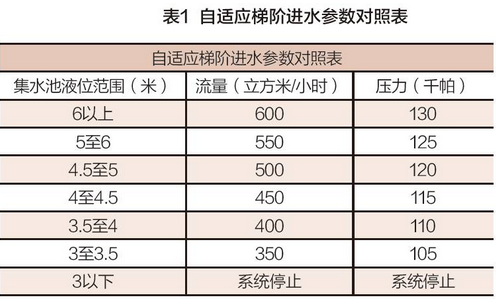 表1是本系統(tǒng)中梯階自適應(yīng)液位與流量壓力的參數(shù)對照表。這里的壓力與流量是對應(yīng)的,其壓力是根據(jù)膜的參數(shù)信息進行對照查詢所得。液位與流量則是通過粗略計算和實驗矯正所得。當(dāng)集水池液位大于6米時,存在溢出風(fēng)險,這個時候系統(tǒng)滿負荷運行。當(dāng)?shù)陀?米時,為了防止提升泵干抽,我們將停止系統(tǒng)運轉(zhuǎn)。