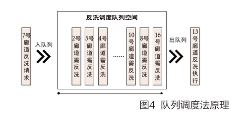這里我們采用隊列法來處理廊道競爭問題。隊列法是一種遵循先進先出原則的調(diào)度方法。具體原理如圖4所示。隊列調(diào)度由入隊列、出隊列和調(diào)度隊列空間三部分組成。入隊列是根據(jù)廊道反洗請求情況將有反洗需求的廊道壓入到隊列空間的過程。出隊列則是根據(jù)當(dāng)前的反洗設(shè)備的運行狀況將需要反洗的廊道彈出隊列的過程。反洗調(diào)度隊列空間即扮演一個存儲調(diào)度序列的角色,同時其還具有優(yōu)化和排布序列的功能。