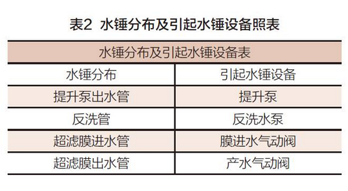 由于本超濾系統(tǒng)規(guī)模大,管道粗,水錘明顯。水錘位置主要存在于本系統(tǒng)的提升泵出水管、反洗管、超濾膜進水管及超濾膜出水管中。對于這些管道及設(shè)備安裝位置可知,各位置引起水錘原因是有所不同,具體如表2所示: