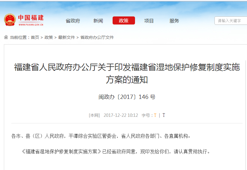福建省人民政府辦公廳關(guān)于印發(fā)福建省濕地保護(hù)修復(fù)制度實(shí)施方案的通知