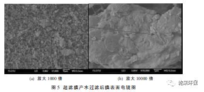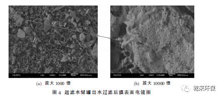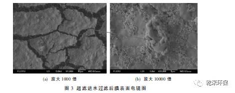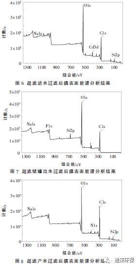③ 超濾進水、超濾水儲罐出水、超濾產(chǎn)水過濾膜表面的SEM分析顯示, 膜面污染物主要成分是微生物產(chǎn)生的有機污染物。能譜分析結(jié)果同時顯示,膜面的污染物主要元素為C、O。因此可以確定,膜處理系統(tǒng)污染堵塞的主要原因,就是微生物滋生產(chǎn)生的有機污染物造成的。