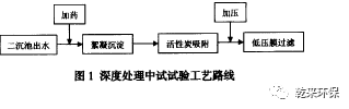 1.3工藝路線:中試試驗(yàn)裝置的處理能力為1.5m3/h,安放在現(xiàn)場二沉池出水附近。工藝路線為,A2/O生化系統(tǒng)處理后的二沉池出水經(jīng)過加藥后進(jìn)入絮凝沉淀反應(yīng)器,上清液進(jìn)入活性炭吸附罐,出水經(jīng)過加壓后進(jìn)入4級(jí)串聯(lián)的低壓膜過濾罐,最終得到深度處理后的廢水,如圖1所示。