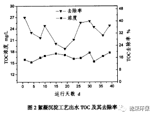 2)集成工藝中的絮凝沉淀工藝出水TOC穩(wěn)定在15—20mg/L,去除率為20%一40%;活性炭吸附工藝的出水TOC穩(wěn)定在12—14mg/L,去除率為12%一32%;而低壓膜的出水TOC穩(wěn)定在9—12mg/L,去除率為5%一30%。