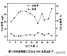 2.2活性炭吸附工藝:活性炭吸附工藝憑借自身的投資節(jié)省、操作簡單和效果顯著等優(yōu)勢,在工業(yè)化廢水處理中具有廣泛的應(yīng)用,特別是對(duì)有機(jī)物具有非選擇性的吸附作用。由于存在物料流失和吸附飽和等不足之處,試驗(yàn)裝置配備了自動(dòng)反洗和蒸汽再生系統(tǒng)?;趯?shí)驗(yàn)室小試的研究結(jié)果,中試試驗(yàn)采用的是廣東鴻生10#顆粒木質(zhì)炭,吸附停留時(shí)間為1.5h,處理結(jié)果如圖3所示。