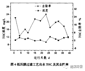 2.3低壓膜過濾工藝:活性碳纖維是碳纖維技術(shù)和活性炭技術(shù)相結(jié)合發(fā)展起來的新技術(shù),具有過濾和吸附的雙重作用,國內(nèi)外關(guān)于采用此工藝深度處理含有機(jī)物的廢水的報(bào)道逐漸增加。本文的低壓膜元件由高活性碳纖維制成,裝填在圓柱形過濾罐中,采用四級(jí)串聯(lián)運(yùn)行方式,每一級(jí)可以單獨(dú)的進(jìn)行反沖洗。主要工藝參數(shù)為,工作壓力為0.15—0.3MPa,孔隙率為85%,過水流量為3.5—4.5m3/(h˙m2)。低壓膜過濾工藝出水TOC及其去除率如圖4所示,