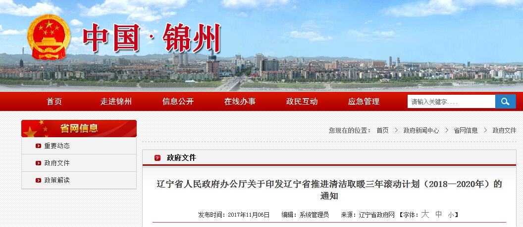 遼寧省人民政府辦公廳關(guān)于印發(fā)遼寧省推進(jìn)清潔取暖三年滾動(dòng)計(jì)劃(2018—2020年)的通知
