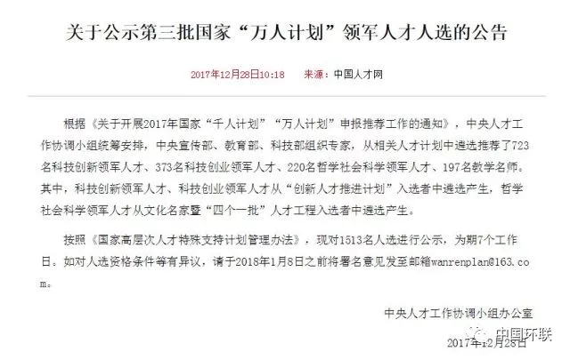 “萬人計(jì)劃”又名“國家高層次人才特殊支持計(jì)劃”,是一項(xiàng)面向國內(nèi)高層次人才的支持計(jì)劃。2012年國家“萬人計(jì)劃”啟動,目標(biāo)是用10年時(shí)間,遴選1萬名左右自然科學(xué)、工程技術(shù)和哲學(xué)社會科學(xué)領(lǐng)域的杰出人才、領(lǐng)軍人才和青年拔尖人才,給予特殊支持。其中,“萬人計(jì)劃”領(lǐng)軍人才計(jì)劃支持8000名國家科技發(fā)展和產(chǎn)業(yè)發(fā)展急需緊缺的創(chuàng)新創(chuàng)業(yè)人才,包括科技創(chuàng)新領(lǐng)軍人才、科技創(chuàng)業(yè)領(lǐng)軍人才、哲學(xué)社會科學(xué)領(lǐng)軍人才、教學(xué)名師和百千萬工程領(lǐng)軍人才等類別。第三批“萬人計(jì)劃”領(lǐng)軍人才共有1513名各領(lǐng)域?qū)<胰脒x,其中723名科技創(chuàng)新領(lǐng)軍人才、373名科技創(chuàng)業(yè)領(lǐng)軍人才、220名哲學(xué)社會科學(xué)領(lǐng)軍人才、197名教學(xué)名師人選。