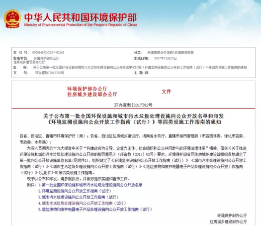今年5月,環(huán)境保護(hù)部、住房城鄉(xiāng)建設(shè)部聯(lián)合印發(fā)《關(guān)于推進(jìn)環(huán)保設(shè)施和城市污水垃圾處理設(shè)施向公眾開放的指導(dǎo)意見》,要求2017年底前,各省級環(huán)境監(jiān)測機(jī)構(gòu)以及省會城市(區(qū))具備開放條件的環(huán)境監(jiān)測設(shè)施對公眾開放;各省(自治區(qū)、直轄市)省會城市選擇一座具備條件的城市污水處理設(shè)施、一座垃圾處理設(shè)施作為定期向公眾開放點;有條件的省份選擇一座危險廢物或廢棄電器電子產(chǎn)品處理設(shè)施作為定期向公眾開放點,各類開放點每兩個月應(yīng)至少組織開展一次公眾開放活動。2020年底前,鼓勵各省在有條件的地級市選擇一座環(huán)境監(jiān)測設(shè)施、一座城市污水處理設(shè)施、一座垃圾處理設(shè)施作為開放點;有條件的省份可新增危險廢物或廢棄電器電子產(chǎn)品處理設(shè)施作為開放點,推動開放工作常態(tài)化。