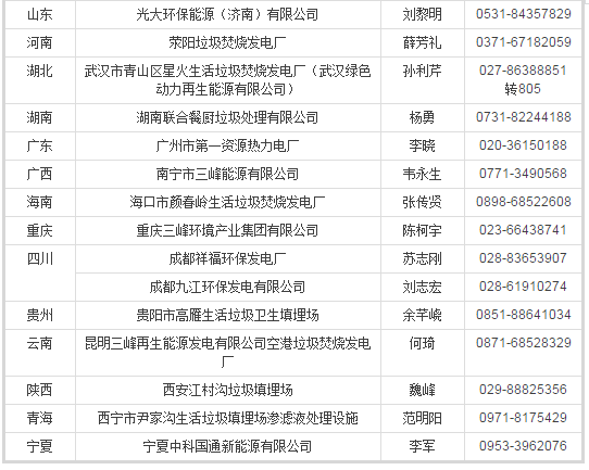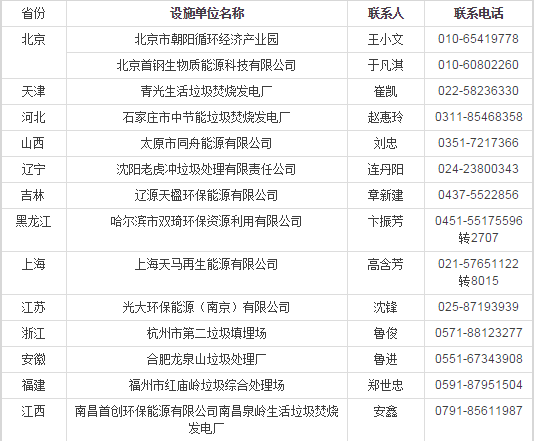 包括29個垃圾處理設(shè)施,其中垃圾焚燒設(shè)施21個,垃圾填埋設(shè)施6個,餐廚垃圾處理設(shè)施1個,滲濾液處理設(shè)施1個,分布于全國27個省、直轄市和自治區(qū),聯(lián)系人與聯(lián)系方式俱全。
