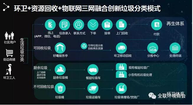 在硬件端,桑德環(huán)衛(wèi)有環(huán)衛(wèi)車、環(huán)衛(wèi)工人,還有一種與社區(qū)垃圾分類連接的“好嘞亭”。再加上再生資源回收系統(tǒng),使它們都與環(huán)衛(wèi)連接在一起,運(yùn)用互聯(lián)網(wǎng)、物聯(lián)網(wǎng)和云計(jì)算,形成一個(gè)信息互聯(lián)互通的網(wǎng)絡(luò)。