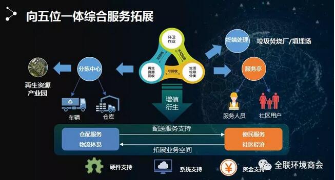 桑德正依托環(huán)衛(wèi)基礎(chǔ),衍生出供應(yīng)鏈及社區(qū)服務(wù),向五位一體的綜合服務(wù)模式拓展。