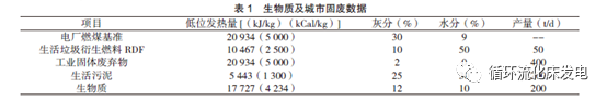 根據(jù)初步分析數(shù)據(jù),擬利用的生物質、城市固廢(生活垃圾、工業(yè)固體廢棄物、生活污泥),其熱值及數(shù)量情況如表1所示。