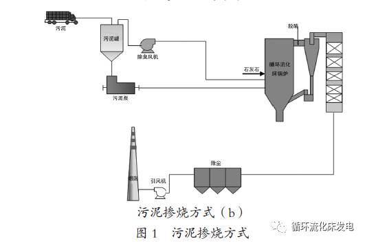 方式(b):生活污泥經污水處理廠脫水后運送至公司污泥罐,污泥罐下部布置污泥泵(柱塞泵)。污泥直接通過污泥泵輸送至爐膛進行燃燒處理。污泥給入口布置播料風,同時布置插板閥以防止污泥系統(tǒng)停運時煙氣反竄。污泥罐上部布置除臭風機,將罐內揮發(fā)氣體送至爐膛進行燃燒凈化。其污泥摻燒方式如圖1(b)所示。