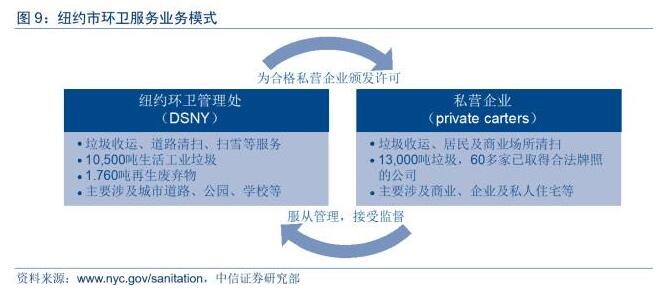 以紐約市為例,其環(huán)衛(wèi)服務業(yè)由政府環(huán)衛(wèi)管理處與私營垃圾運輸公司共同運營,但私營公司受到環(huán)衛(wèi)管理處監(jiān)管,并要遵守相關地方規(guī)范。紐約市環(huán)衛(wèi)管理處(DSNY)主要職責是垃圾收運、道路清潔和清雪,它是世界上最大的環(huán)衛(wèi)管理處,負責每天收運紐約市的10,500噸生活垃圾和工業(yè)垃圾以及1,760噸再生廢棄物。紐約市另外13,000噸垃圾由私營垃圾運輸公司(PrivateCartingCompanies)進行收運,環(huán)衛(wèi)管理處對這些私人運營負責行使監(jiān)督管理職責,并發(fā)布其需要遵守的法律法規(guī)。