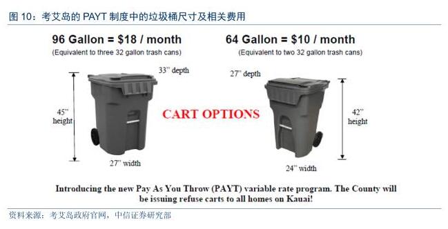 PAYT制度通常下的定價模式有全單位定價模式、部分單位定價及浮動定價等三種模式。以全單位定價的PAYT模式為例,居民首先需要購買由當?shù)卣y(tǒng)一印刷的標牌,并將標牌粘貼到一定容量的垃圾袋上;或者根據(jù)自己產(chǎn)生垃圾量大小向政府申請垃圾桶,政府根據(jù)垃圾桶大小而收費。以夏威夷州的考艾島為例,該地區(qū)在2015年7月開始實行PAYT制度,居民可以選擇兩種尺寸的垃圾桶,一種是96加侖的垃圾桶,每月需付費18美元,一種是64加侖的垃圾桶,每月需付費10美元,一個64加侖的車,每月10美元。