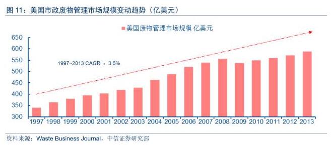 根據(jù)WasteBusinessJournal統(tǒng)計,美國市政廢物管理市場規(guī)模自1997年的341億美元持續(xù)攀升至2013年的589億美元,期間復合增速為3.5%,高于同期人口增速和廢物產(chǎn)生量增速。受金融危機影響,市場規(guī)模自2008年的55.7億元略微下滑至2009年的53.7億元,但在2011年即恢復至金融危機前的水平。