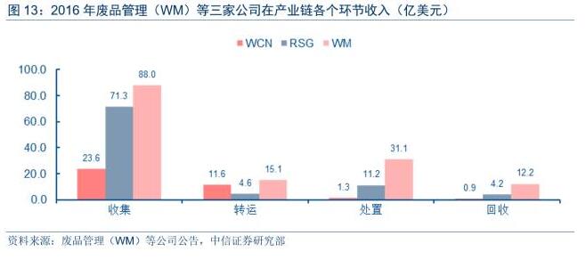 美國環(huán)衛(wèi)市場為典型的一體化模式,相關企業(yè)在大力參與前端收集&轉(zhuǎn)運業(yè)務同時,后端處置及資源回收領域也積極布局和參與,以充分發(fā)揮協(xié)同和提升公司競爭優(yōu)勢。從廢品管理(WM)等三家全國性市政廢物管理公司的2016年收入構成看,收集&轉(zhuǎn)運業(yè)務收入分別占到三家公司2016年內(nèi)部抵消前總營業(yè)收入的63%、75%和94%,后端處置分別站到合并抵消前營業(yè)收入的19%、19%和4%。