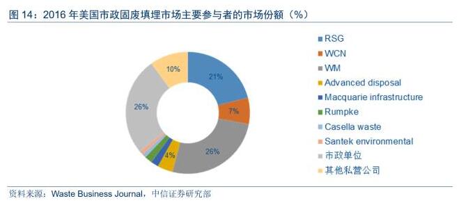 廢品管理(WM)等美國三大環(huán)衛(wèi)龍頭公司除在前端收集及轉(zhuǎn)運已經(jīng)牢牢樹立壟斷地位外,多年來通過在后端處置環(huán)節(jié)的持續(xù)大力參與,目前在填埋環(huán)節(jié)的領先優(yōu)勢也異常明顯。2016年,三大環(huán)衛(wèi)公司在填埋市場份額占比合計高達54%,WM、RSG及WCN在市政廢物總填埋量中占比分別為26%、21%、7%,填埋市場的寡頭壟斷特征突出。