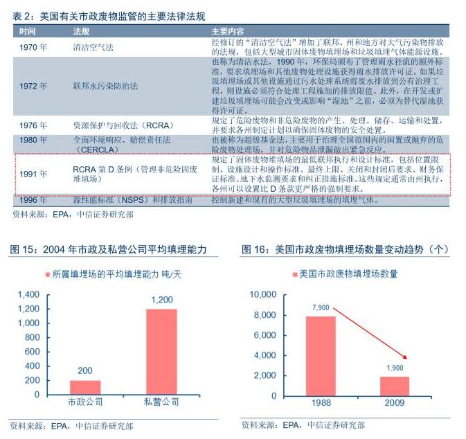 上世紀90年代,美國市政廢物填埋場曾經(jīng)爆發(fā)大氣、土壤、水源污染一系列環(huán)境污染問題,導致居民對于社區(qū)周邊建設和運營垃圾填埋場的反對聲音日益高漲。針對上述環(huán)境問題,1991年,專門用于監(jiān)管非危廢填埋場的《資源保護與回収法》D條例頒布,大幅提升了市政廢物填埋場的設計、運營及環(huán)保等標準。受此影響,大量靠近社區(qū)或運營不達標的填埋場在上世紀90年代被迫關停,且填埋場的建設和運營成本上升明顯。根據(jù)EPA的統(tǒng)計,美國市政廢物填埋市場數(shù)量自1988年的7,900座下滑約75%至2009年的1,900座,填埋場數(shù)量降幅明顯。