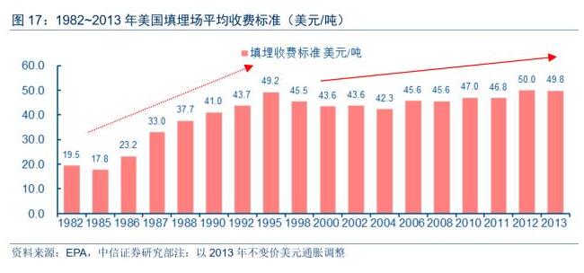美國市政廢物的填埋平均價格自1985年的17.8美元/噸上升至1995年的49.2美元/噸,10年間價格漲幅接近3倍,收費上漲的主要原因是監(jiān)管加嚴和標準提升帶動填埋場的建造和運營成本上升明顯,此階段是典型的成本拉動型價格上漲。在2000年之后,廢物填埋收費呈現(xiàn)溫和且持續(xù)的上漲,自2000年的43.6美元/噸溫和上漲至2013年39.8美元/噸,2000~2013年價格復合增速為1.1%,通脹及寡頭壟斷的市場結(jié)構是該階段價格上漲的重要推動力。