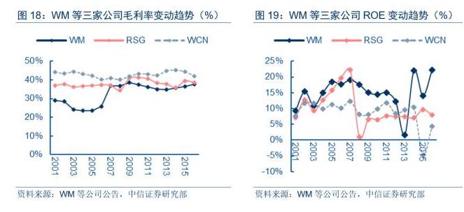 美國環(huán)衛(wèi)龍頭公司的毛利率及凈資產(chǎn)收益率(ROE)等財務指標持續(xù)表現(xiàn)突出。在2007~2016年的過去10年中,廢品管理(WM)、共和服務(RSG)、廢物聯(lián)合公司(WCN)的毛利率全部維持在35%之上,其中廢物聯(lián)合公司(WCN)長期維持在40%之上。從凈資產(chǎn)收益率看,上述三家公司的凈資產(chǎn)收益率過去10年的均值分別為15%、8%和8%,其中廢品管理公司的凈資產(chǎn)收益率顯著超出其他兩家公司,主要是因為相比兩個競爭對手,公司擁有更高的資產(chǎn)周轉(zhuǎn)率和財務杠桿。