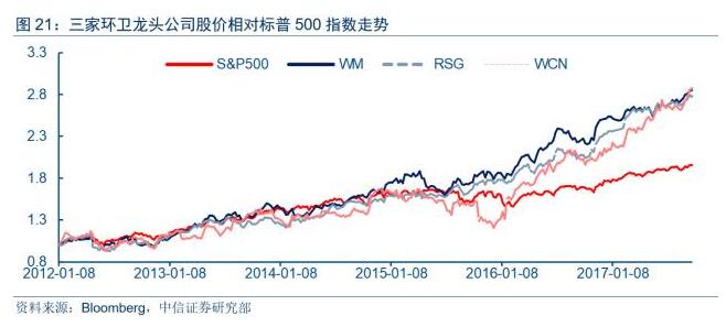 高股息率、不依賴外部融資和突出的定價能力對投資具有較強吸引力。從公司股價相對標普指數(shù)走勢看,三家環(huán)衛(wèi)龍頭股價均顯跑贏標普500指數(shù),具有較明顯的相對收益。