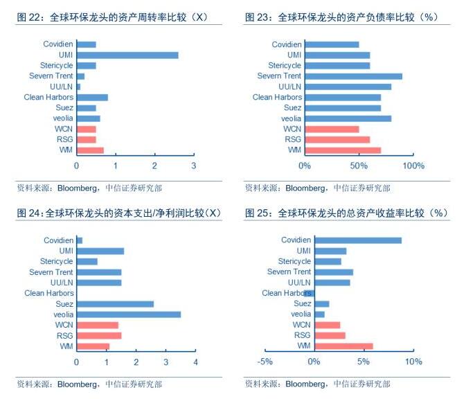 為厘清環(huán)衛(wèi)公司的商業(yè)模式為輕資產(chǎn)還是重資產(chǎn),我們選取了總資產(chǎn)收益率(ROA)、資產(chǎn)周轉(zhuǎn)率、資產(chǎn)負債率、資本支出/凈利率等4個財務指標,將廢品管理(WM)等3家美國環(huán)衛(wèi)公司的財務比率與國際上的水務、固廢、危廢領域代表公司進行對比,可以看出美國環(huán)衛(wèi)公司的資產(chǎn)周轉(zhuǎn)率和資產(chǎn)負債率處于行業(yè)平均水平,資本支出/凈利潤略低于行業(yè)平均,由此可見美國環(huán)衛(wèi)公司的重資產(chǎn)特征突出。以資產(chǎn)周轉(zhuǎn)率為例,2016年,廢品管理(WM)、共和服務(RSG)、廢物聯(lián)合公司(WCN)三家公司的資產(chǎn)周轉(zhuǎn)率分別為0.7x、0.5x、0.5x,和蘇伊士、威立雅的0.5x、0.6x基本接近。
