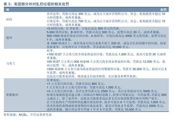 目前在美國,道路清掃業(yè)務市場規(guī)模相比清運和清理而言幾乎可以忽略不計,主要原因是美國道路清掃需求較低,這和國內(nèi)環(huán)衛(wèi)市場以清掃為主的現(xiàn)狀存在顯著差異。美國亂扔垃圾是一種犯罪行為,50個州均制定禁止亂扔垃圾的法律,罰款范圍從科羅拉多州的20美元到馬里蘭州的30,000美元,且在更嚴重情況下會處以監(jiān)禁,比如說在愛達荷州的刑期為10天,在田納西州高達6年。對亂扔垃圾嚴格立法導致美國道路較為整潔,大多數(shù)城市的道路清掃頻率為每周一次,部分城市甚至每個月做一次道路清掃,道路清掃的需求非常低,相應導致清掃業(yè)務市場規(guī)模比較小。